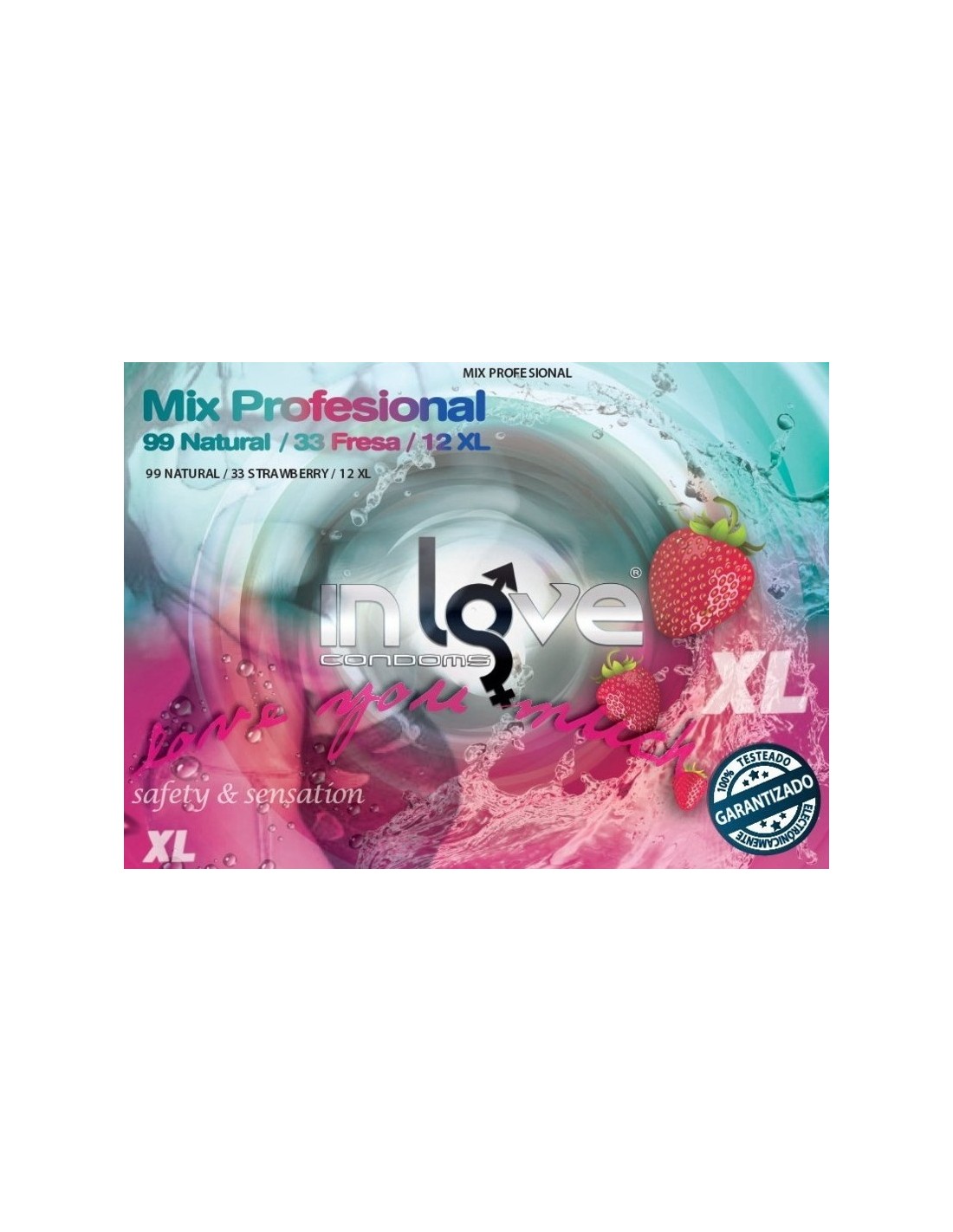 En 48 tiras de 3 preservativos IN LOVE CONDOMS (33 naturales / 11 fresa / 4 XL). Tamaño de la tira: 165x55 mm.