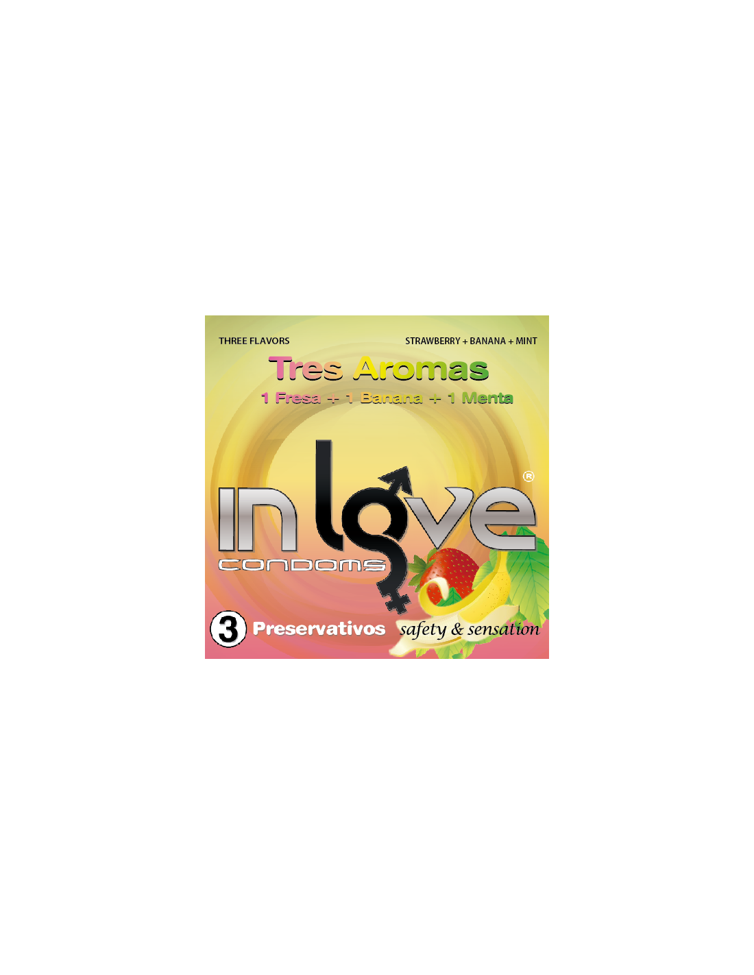 Caja de 3 preservativos IN LOVE CONDOMS: 1 fresa, 1 banana y 1 menta.