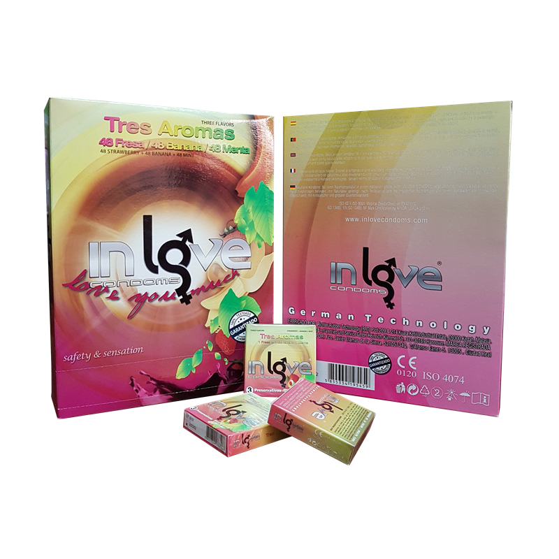 Gruesa expendedora 144x48x3: 144 preservativos IN LOVE CONDOMS en 48 cajitas de 3 preservativos. 48 fresa, 48 banana y 48 menta.