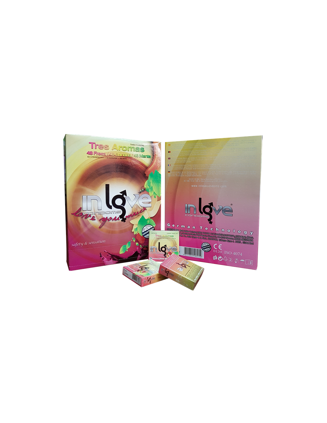 Preservativos IN LOVE CONDOMS aromatizados con lubricante de silicona y deposito.